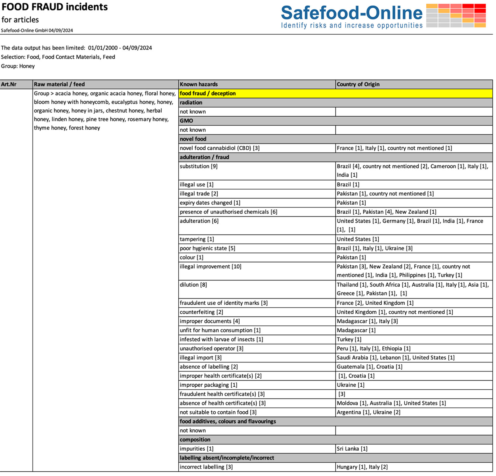 The last results sheet (figure 10) shows all food fraud cases - according to the number of known incidents - for the selected time period.