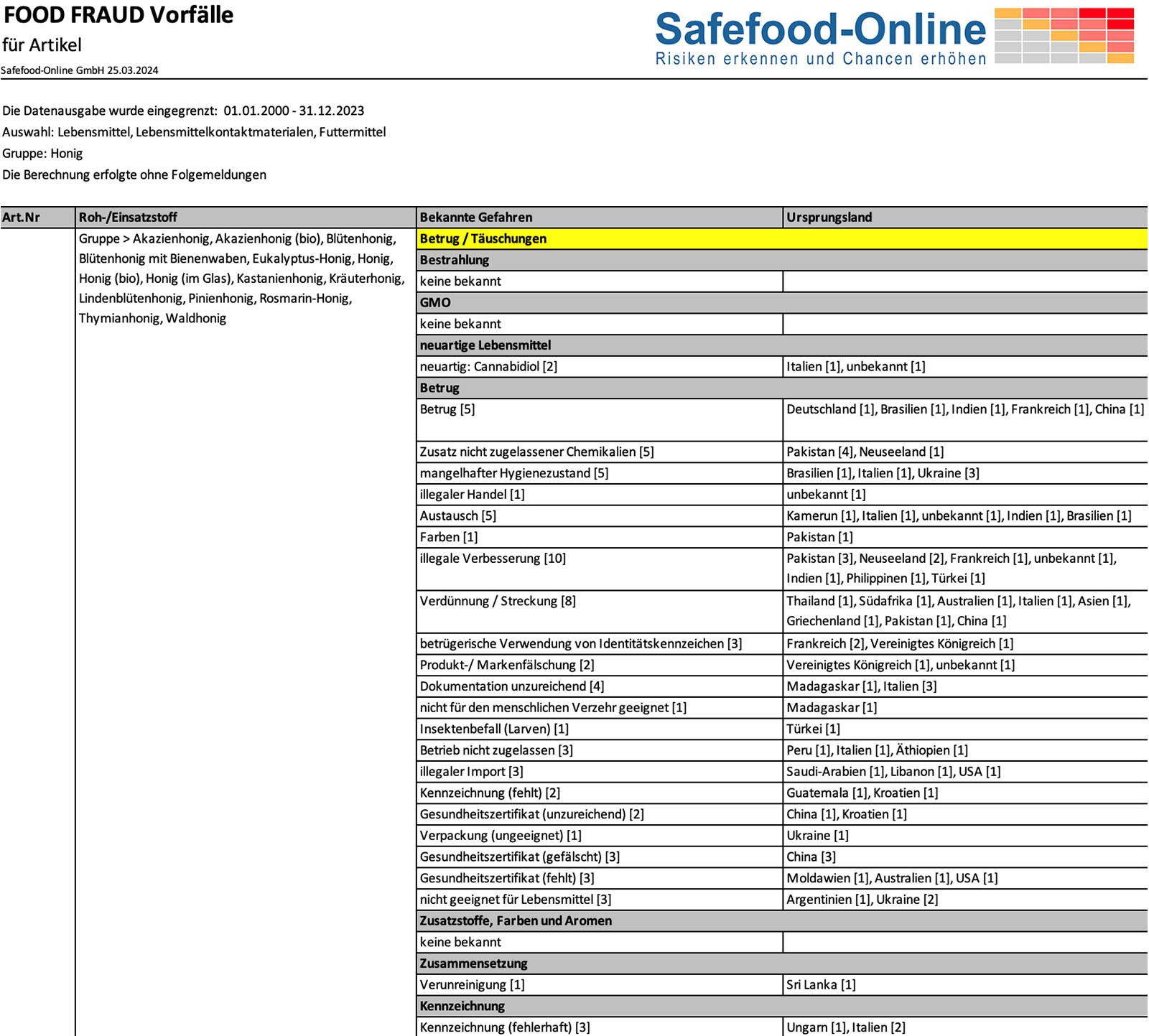 Auf dem letzten Ergebnisblatt (Abb. 10) werden alle Food Fraud Fälle – entsprechend der Anzahl bekannter Vorfälle – für den gewählten Zeitraum dargestellt.