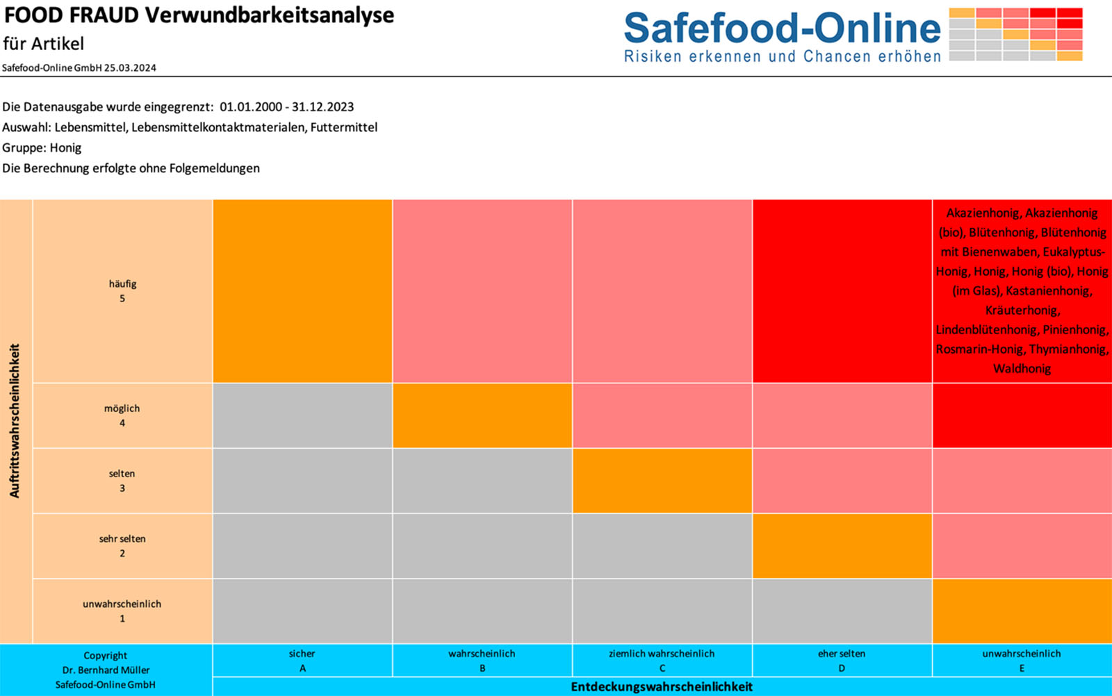 Für diesen Prozess stellt SAFEFOOD-ONLINE mit dem Modul „Food Fraud“ ein effizientes Werkzeug zur Verfügung. Analog zum Modul „HACCP Export“ sind zunächst die Rohstoffe bzw. Rohstoffgruppen auszuwählen. Die Schwachstellenanalyse in SAFEFOOD-ONLINE startet mit jeweils vier Fragen zu den Themen Auftritts- und Entdeckungswahrscheinlichkeit.