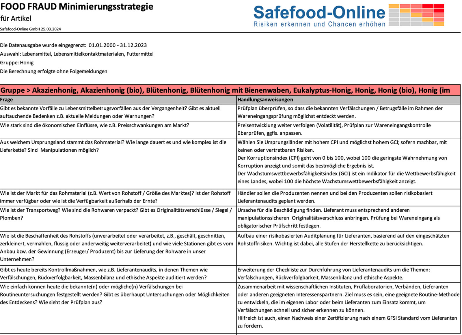 Mit dem dritten Blatt (Abb. 9) wird eine Liste mit empfohlenen Handlungsanweisungen ausgegeben. Diese basieren auf dem GFSI-Regelwerk und entsprechen somit auch den Zertifizierungsstandards wie dem BRC, IFS Food oder FSSC 22000. So unterstützt die Datenbank SAFEFOOD-ONLINE den User auch bei strategischen Entscheidungen zur Risikominimierung. Hier gibt es ebenfalls die Möglichkeit, unternehmensspezifische Handlungsanweisungen aufzunehmen und so die Minimierungsmaßnahmen noch besser an die eigene Unternehmenssituation anzupassen.